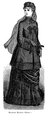 The image on the top is of a set of jet and gutta percha mourning jewelry. The middle image is a depiction from an 1884 Harper’s Bazar of a woman wearing a mourning mantle. This