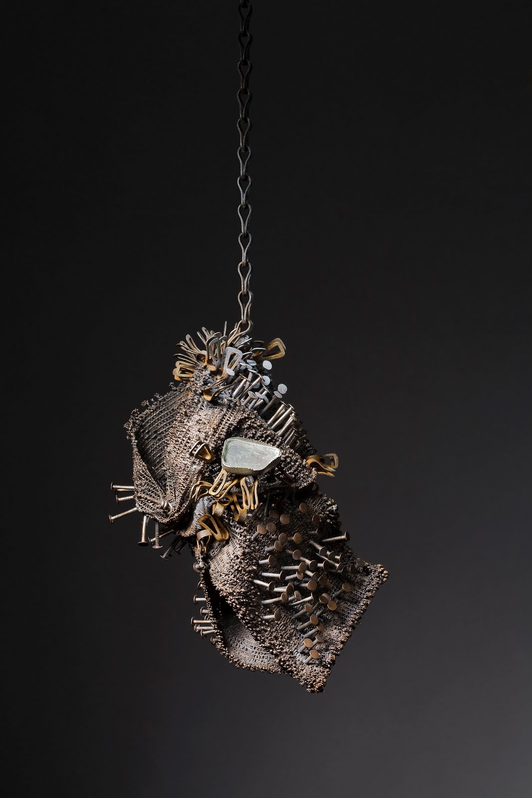 The conglomerate objects made of industrial detritus are steeped in concepts of lapsed history, time, neglect, and fate. They also seem to become bodily, referencing lace-like internal organs; making the viewers relationship to them that much more intimate.