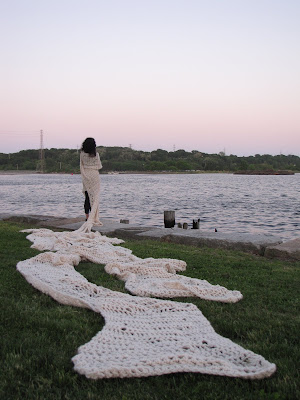 I am excited to have If a Mouth were to Whisper in the show; the intimate quality of this craft-rooted piece will compliment the metal work in the show. The image to the right is documentation of the piece, which is easily over 100 feet long and took approximately 50 hours to complete. This piece just exudes feelings of memory, comfort, vulnerability, and attentiveness. I really appreciate the pliability of the work, and how it both interacts with the body in a loving/cocoon like manner and simultaneously drags behind with excess physical and conceptual weight.