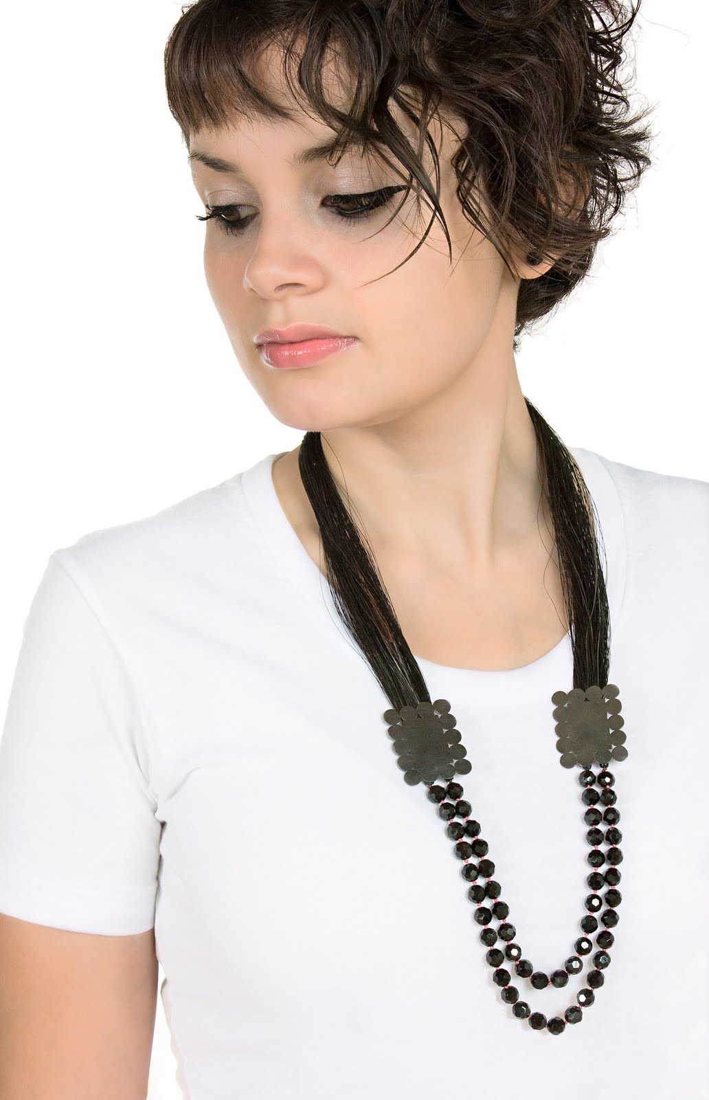So, a couple of weeks ago I had some of my recent work documented by Maureen Keaveny… and I’ve just been dying to see what the photos look like. I just got an email from Maureen with a tantalizing image that has gotten me so amped up for the rest of the set. The image below is of one of my Mourning Necklaces being worn by Olivia. The necklace is made of horse hair, sterling silver, silk, and antique jet beads. After feasting my eyeballs on this, it’s going to be even more difficult to wait for the rest of the images!