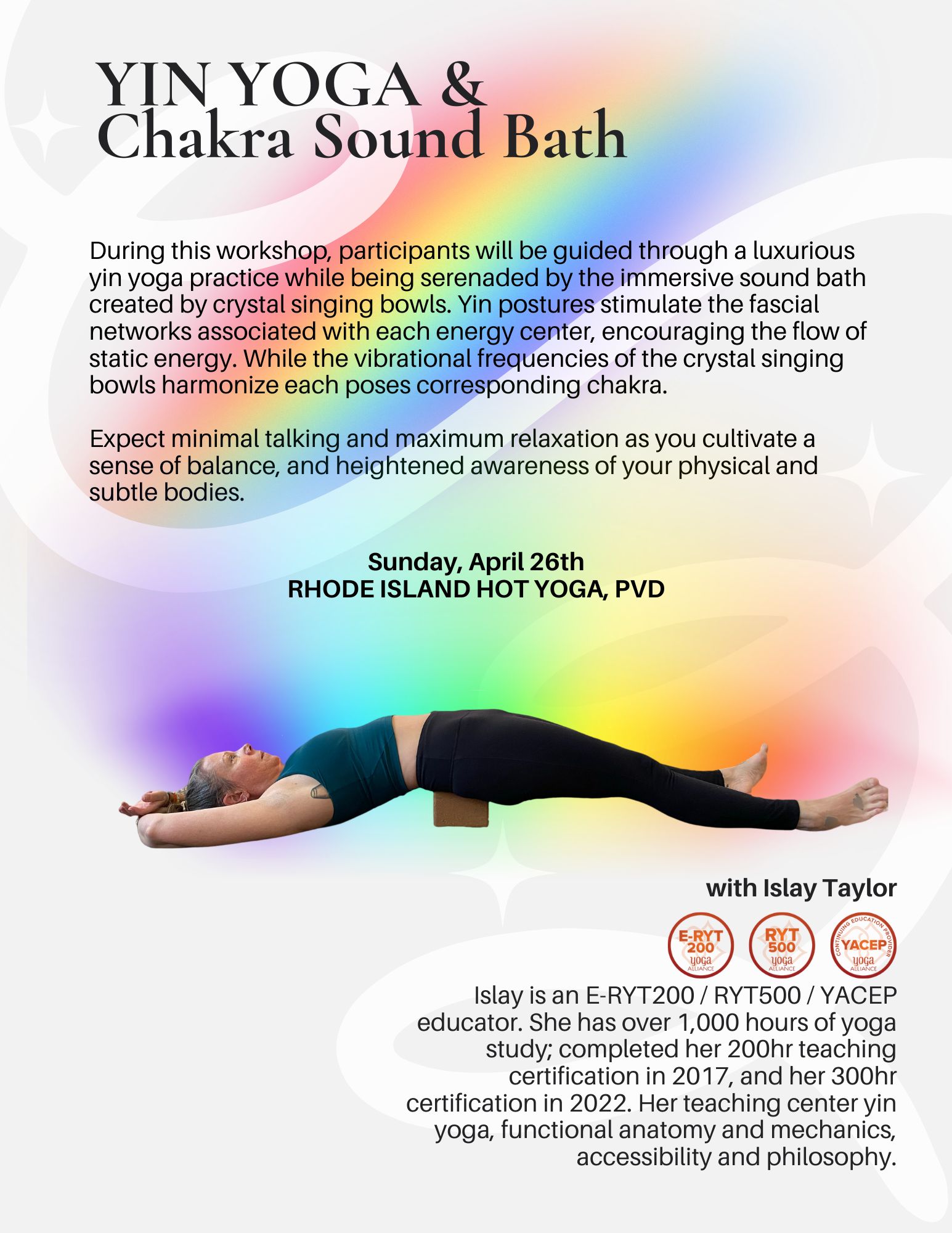 During this workshop, participants will be guided through a luxurious yin yoga practice while being serenaded by the immersive sounds of crystal singing bowls. The yin postures stimulate the fascial networks associated with each energy center, encouraging the flow of static energy. While the unique vibrational frequencies of the crystal singing bowls harmonize the corresponding chakra.
